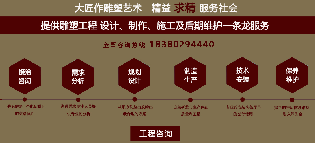 成都大匠作雕塑有限公司,是經(jīng)成都工商局審定注冊的正規(guī)專業(yè)雕塑制作及工程安裝服務(wù)機(jī)構(gòu),是由一群年輕富有朝氣的年輕人創(chuàng)辦,發(fā)軔于四川省成都市龍泉驛區(qū)。它是一家******于創(chuàng)作、制作和銷售為一體的公司。大匠作擁有多年從事公共藝術(shù)的專業(yè)人員和雕塑制作人組成的核心團(tuán)隊,為您提供專業(yè)、具創(chuàng)新的設(shè)計及制作服務(wù)。公司成立以來,秉承“******服務(wù)、誠信為本”的宗旨,以客戶需求為目標(biāo)導(dǎo)向,不斷學(xué)習(xí),進(jìn)取,優(yōu)化和提高服務(wù)質(zhì)量,公司向您******——“您的滿意***是我們的信譽(yù)”,我們將以飽滿的熱情和******的服務(wù)贏得您的贊譽(yù)和支持。 愛心,細(xì)心,耐心,責(zé)任心是我們的要求,盡心盡職,為您打造出創(chuàng)新、專業(yè)、******的設(shè)計方案,我們堅信先做人、后做事,用心對待客戶,實行透明收費,人性化服務(wù),本著對客戶負(fù)責(zé),對客戶負(fù)責(zé),更是對自己發(fā)展負(fù)責(zé)的態(tài)度,爭取做到讓每位客戶滿意